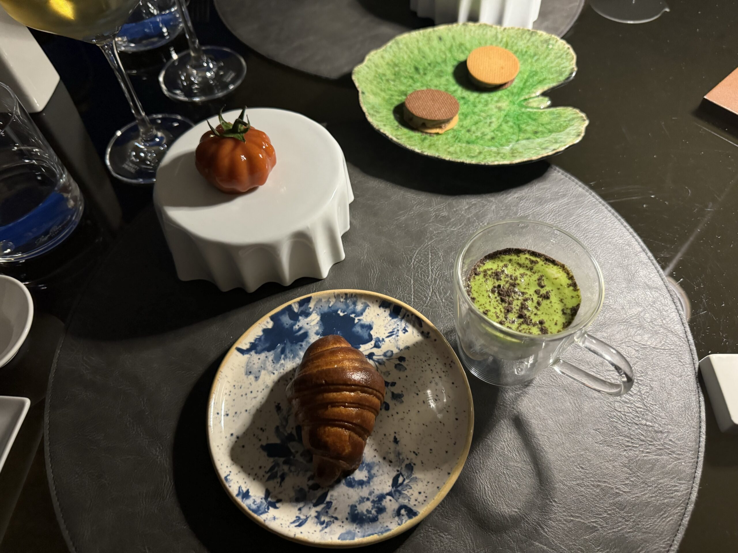 cappuccino di spuma di porri, piselli e polvere di tartufo nero Pregiat o – ?croissant di pan brioche s – finto pomodorino di pappa al pomodoro – ringo di patè di jpg