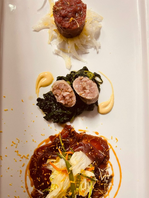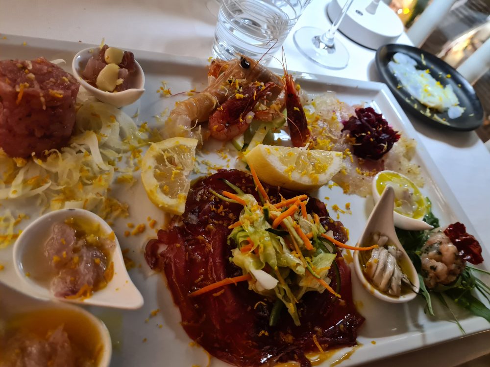 Il crudo, come dicevamo, ruba senz’altro la scena, a partire dai crostacei con scampi e gamberi con zeste di arancia. Si prosegue in senso orario con il carpaccio di cernia marinato con anice, finocchietto e pepe rosa mentre nel cucchiaio c’è la seppiolina olio e limone e sul letto di rucola una tartare di gambero con olio alla vaniglia e peperone crusco. Sempre continuando, le alici marinate secondo tradizione e il carpaccio di tonno agli agrumi affiancato da altri crudi come quello di sarago all’arancia e quello di ricciola in carpione con aceto di vino bianco. C’è anche il baccalà, portato in un piattino a parte, condito con olio e limone ed una tartare di alalunga con colatura di alici ed erba cipollina. Chiude la parata un dado di palamita affumicato accompagnato da un Caesar dressing.