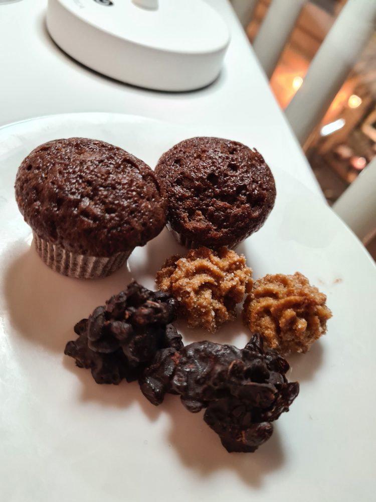 La piccola pasticceria chiude deliziosamente la cena con mini muffin al cioccolato, pasta di mandorle e fondente reso croccante dal riso soffiato.