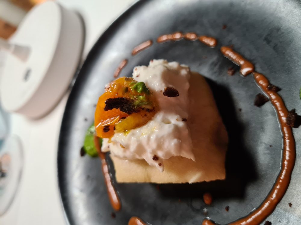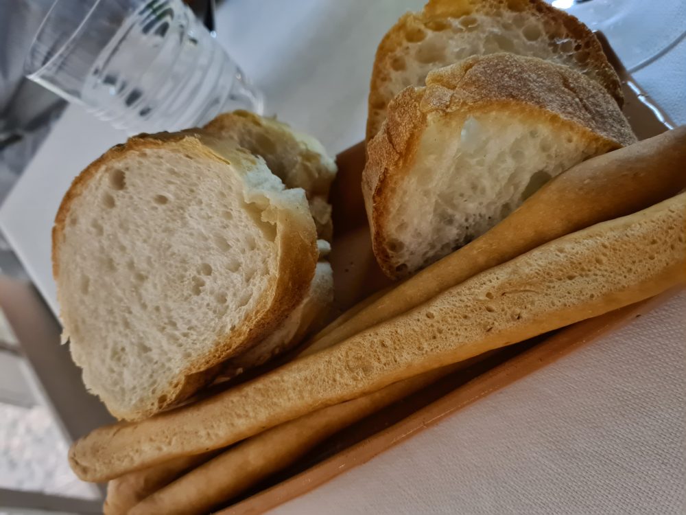 Sul terrazzo più romantico di Amalfi il pasto inizia con il benvenuto della casa, magari accompagnato da qualche bolla: per noi c’era una focaccina con stracciata, pomodorini confit, polvere di olive nere e pesto alla rucola ma tutte le portate variano ovviamente in base alla stagione e alla proposta del giorno e si lasciano accompagnare dalla selezione di pane da lievito madre, pane cafone e con dei grissini al burro.