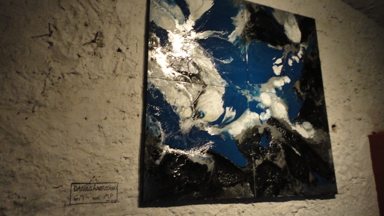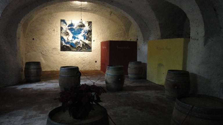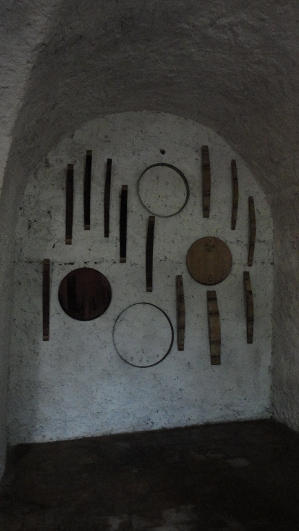 E’ sicuro spiega Manuela che in questo luogo, comunque, si sia sempre fatto vino, lo testimoniano le due grandi vasche per la fermentazione, e il pozzo profondo 25 m, intorno alla stanza, ancora, la destrutturazione di una botte sulla dx, una curiosa fornacella a sx e davanti a noi un’opera d’arte contemporanea firmata Danilo Ambrosino, visione dall’alto di un’esplosione di creatività, segno del passato che immutato vive nel presente!!