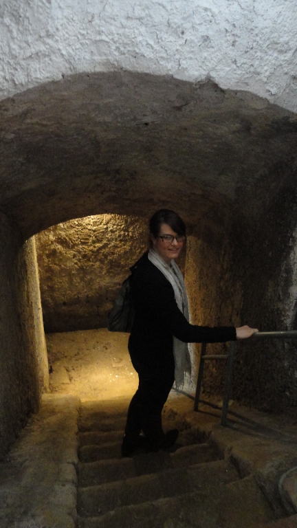 Ma una scala…. eleva grande curiosità, scendiamo a 15 m di profondità, ci ritroviamo nel bel mezzo di una cattedrale del vino, un luogo senza tempo, completamente in tufo nelle cui volte si leggono i segni di milioni di scalpellate, una fatica immane, direi, ma che è ripagata dalla conquista di un ambiente perfetto per la conservazione del vino.