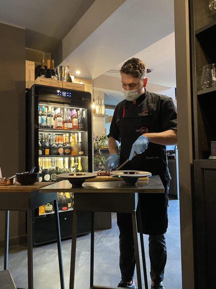 La carne – conservata in tanto di cella frigorifera a vista – è selezionata, lavorata e raccontata dalla figura professionale del “meat consultant”, che conosce l’intera filiera della materia prima proposta. Pasquale Vedetta ricopre questo ruolo, in The Meat, del quale è proprietario insieme con la famiglia, i cui membri sono esperti in fatto di carni, essendo da generazioni selezionatori di capi.