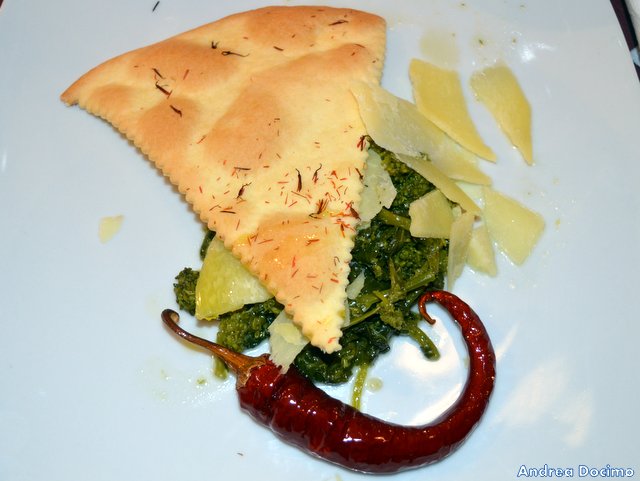 In apertura, broccoli aprilatici di Paternopoli, Caciocavallo Podolico con foglie ai pistilli di zafferano e peperone crusco. Accostamento interessante: con qualche piccolo accorgimento in fase di preparazione lo sarebbe stato ancor di più.