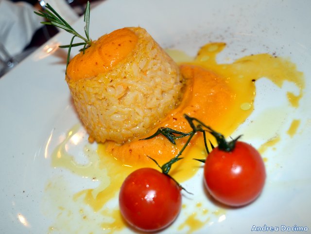 E’ stata poi la volta del tortino di riso infornato con zucca, taleggio e liquirizia (percepibile nel retrogusto).