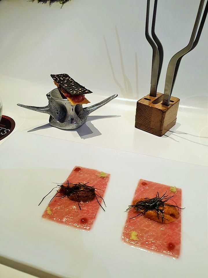 Tickets, ventresca di tonno in grasso di prosciutto e ciliegia affumicata