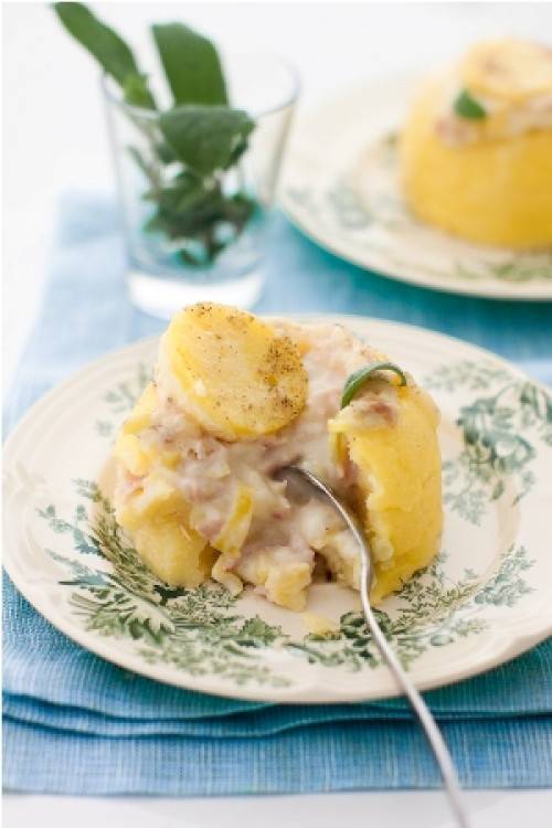 Sformate i timballi. Con un bicchierino o piccolo coppapasta imprimete sull’apice dei timballi un segno. Prendendo come riferimento questo segno, svuotate con cucchiaino il timballo, mantenedo integra una calottina di polenta che sistemerete alla fine. Siate precisi, svuotatelo mantenedo le pareti integre e poi riempitelo con la salsa preparata. Spolverizzate con pangrattato e coprite con la calottina. Infornate a 200° per 10 minuti o fino a doratura della superficie. Guarnite con foglioline di salvia.