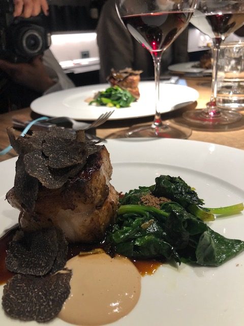 Grande avvolgenza in bocca data dall’alcolicità( 15,8% vol), una suadenza perfetta con crepinette di foglie di cardi e ravanelli, misticanza selvatica avvolta con rete di maiale e il suo sugo. Un piatto orientale e altoatesino insieme ottimo con la rotondità di questo Gewurztraminer. Alto Adige Lagrain Rosato DOC 2018 è un vino che incarna perfettamente la tradizione. Rosa cerasuolo propone al naso fragola e lieve pepe rosa, ribes. La bocca è fresca e percorsa a lungo dalla sapidità, il tannino è sottile come una lama. A.A. Santa Maddalena classico DOC Vigna Premstallerhof 2018 nasce su un terreno misto di porfido e granito, un appezzamento a regime biodinamico. E’ un vino fine, delicato sia nella freschezza che nella mineralità, ricorda le montagne, il sottobosco la sua umidità e i suoi profumi. L’abbinamento con i bottoni di lingua, spuma di prezzemolo e salsa di pepe verde è ancora una volta riuscito e molto piacevole. Il controfiletto di vitello quasi alla Rossini è abbinato all’ Alto Adige Pinot Nero Riserva DOC Select 2016 vino elegante e fruttato, fresco e scorrevole in bocca, insieme all’ Alto Adige Lagrein Gries Riserva Doc Select 2016 vino armonico dove troviamo esaltate la ciliegia e le spezie, il cioccolato o meglio la polvere di cacao in un tannino non troppo severo. La macedonia di miele e mandarini è accompagnata dall’ Alto Adige Gewurztraminer Passito Doc Cresta 2016 giallo dorato è un sorso speziato e mielato, rotondo con sentori di zucchero filato e caramello ma anche fiorito. Tanta dolcezza è bilanciata dalle foglie di acetosella della macedonia che equilibrano il tutto. I piatti abbinati a questi vini sono quelli che trovate al ristorante Retrobottega a Roma fulcro di una cucina attuale, piena di sapore e profumo che rivisita piatti della tradizione con estro e gusto ponendo l’accento sulla materia prima e la stagionalità.