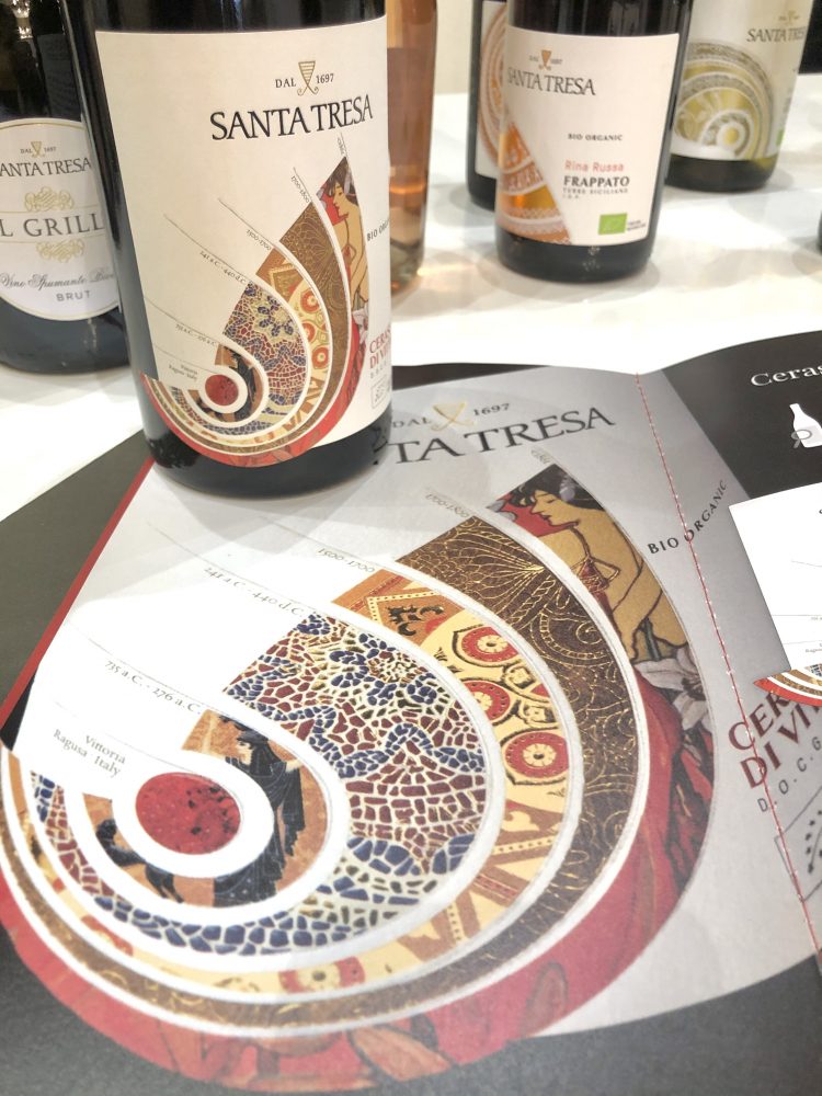 L’etichetta del Cerasuolo di Vittoria Santa Tresa, risultato di un recentissimo restyling, riporta l’immagine di una sorta di chiocciola. Al centro un punto rosso che rappresenta la Sicilia attorno a cui si avviluppano le tante culture che nei secoli si sono succedute sull’isola, da quella Greca a quella Romanica, poi gli Arabi, i Normanni, gli Aragonesi e gli Spagnoli fino al 1700 quindi il periodo Borbonico e il Regno delle Due Sicilie fino al 1861.