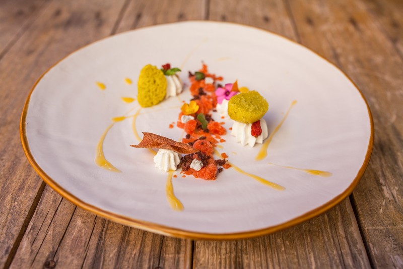 Schizzare in un piatto bianco, precendemente ghiacciato, la crema di datterino giallo con l’aiuto di un biberon, disporre 3 ciuffi più grandi e uno più piccolo di ricotta di bufala sfalsati l’uno dall’altro. Su di essi disporre una madeleine tagliata a spicchio, un datterino confit e una chips di castagna. Aggiungere la granita di datterino e adagiare sopra di essa lo shortbread sbriciolato, 3-4 capperi sabbiati.
