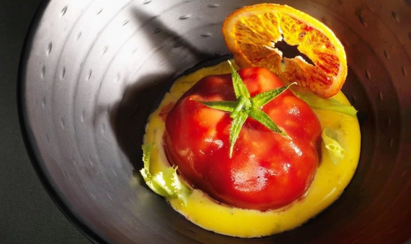 In una fondina adagiare un cucchiaio di maionese, posizionare il falso pomodoro e guarnire con la chips di arance e qualche foglia presa dal cuore di scarola riccia.