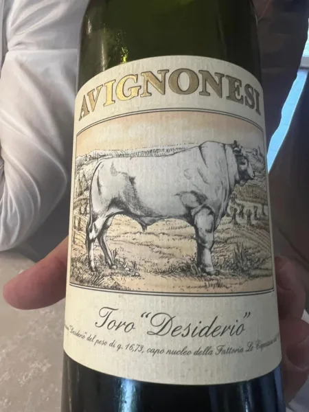 Invece vuole essere solo il racconto ai lettori che seguono il nostro giovane gruppo di una bevuta inaspettata e straordinaria, scelta dal sommelier Roberto Tornabene nella splendida cantina di Nino Di Costanzo, patron del bistellato Dani Maison a Ischia.Il Toro Desiderio è realmente vissuto, togliamoci la curiosità di un nome un po’ kitch, una bestia da 16 quintali vissuta oltre un secolo fa alla fattoria Le Capezzine di Avignonesi più di cento anni fa e che avrebbe dettato le regole nella definizione genetica moderna della razza Chianina.