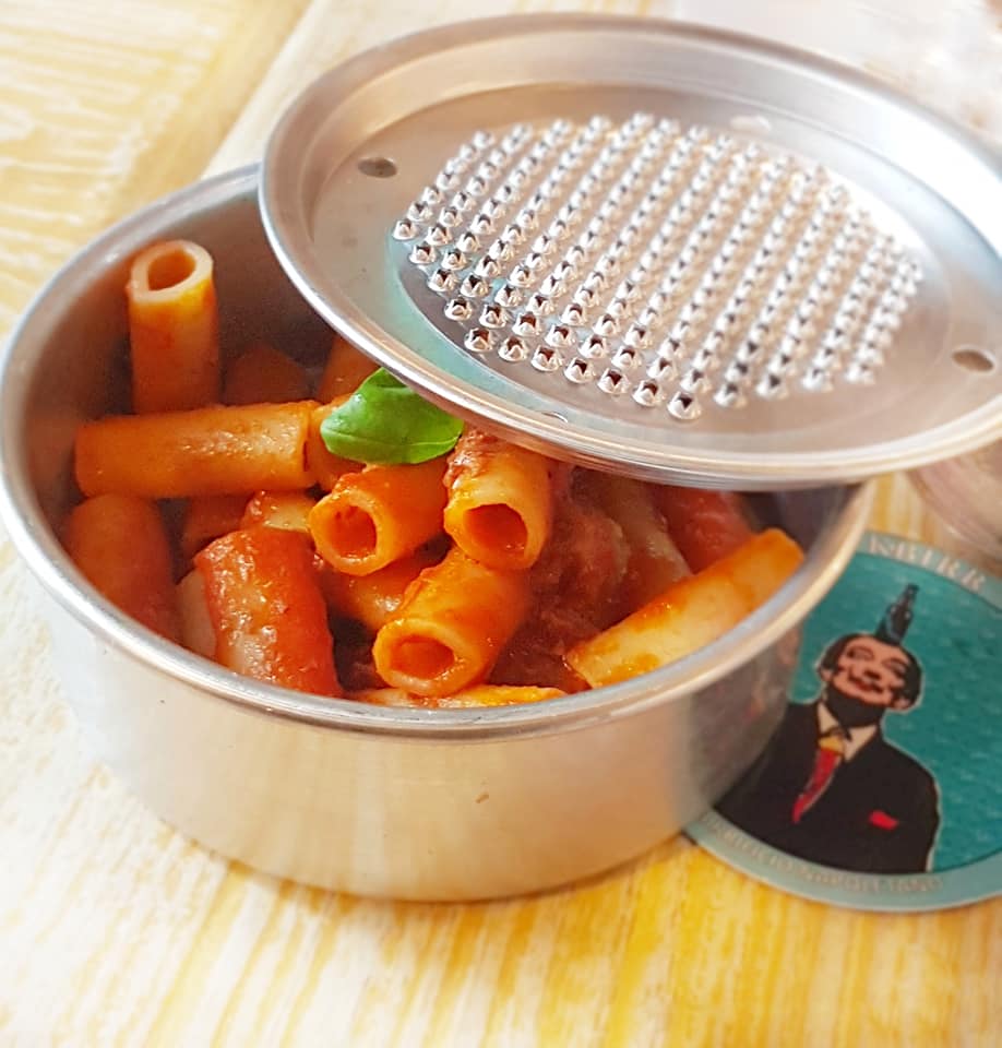 I primi piatti, come per esempio la pasta e patate ed il ragù, sono serviti nelle grattugia formaggi d’acciaio e gli spaghetti, presentati in piccole porzioni “a furchettata”, invitano l’ospite ad assaggiare più portate senza appesantirsi al primo assaggio.