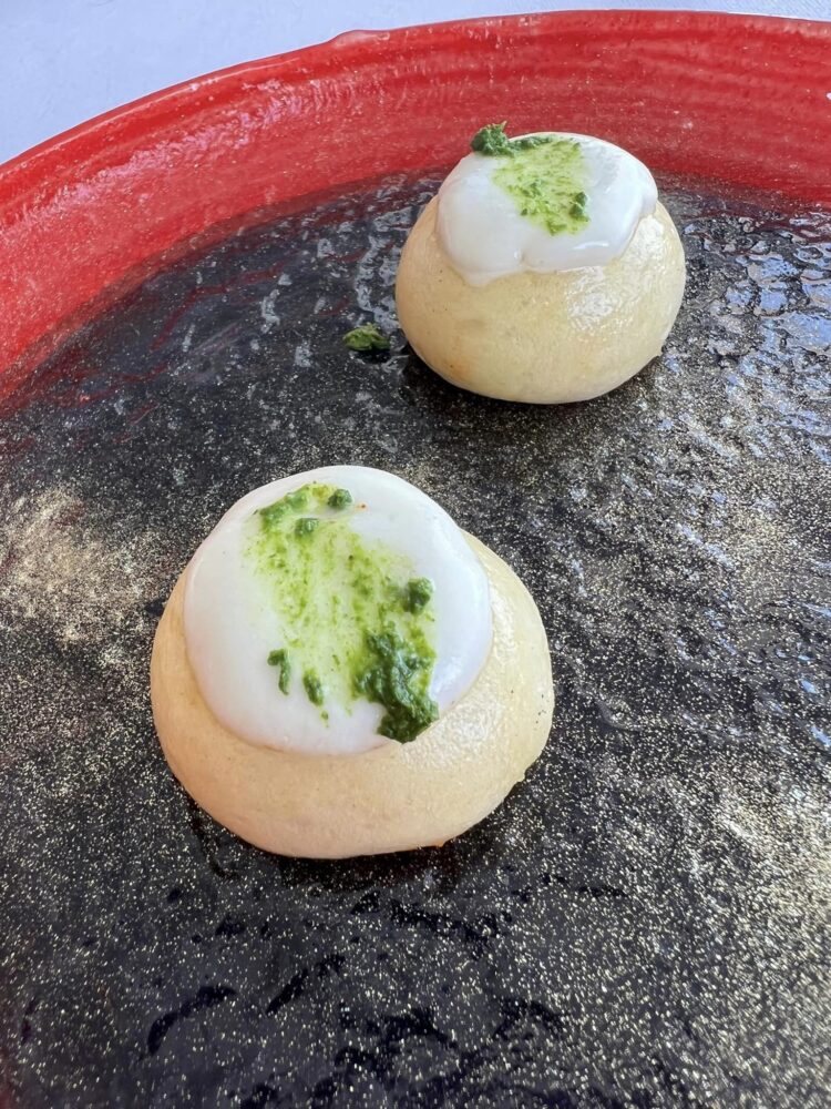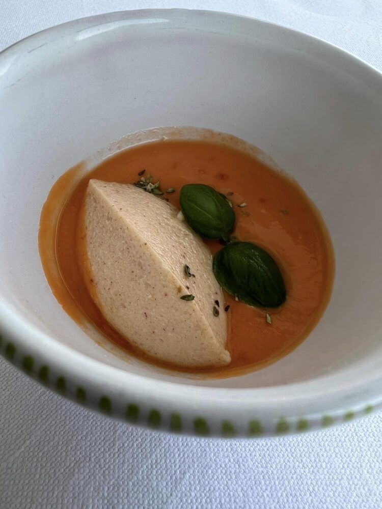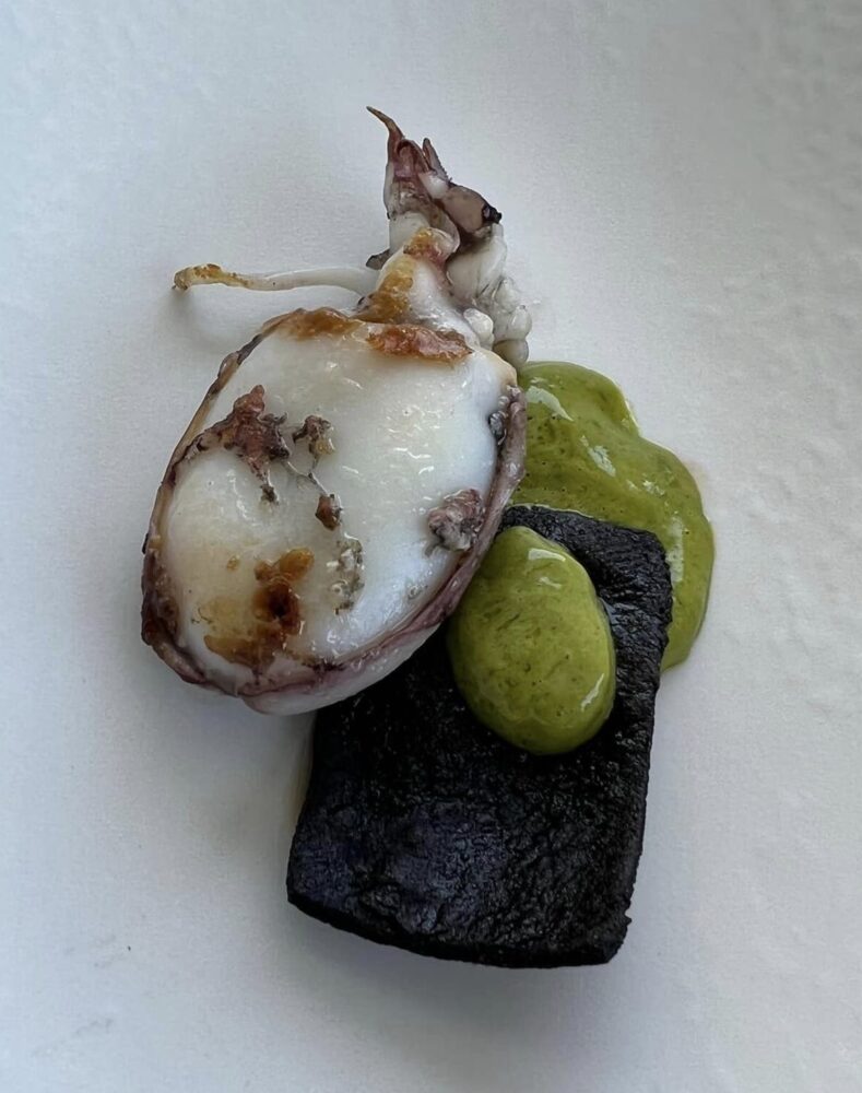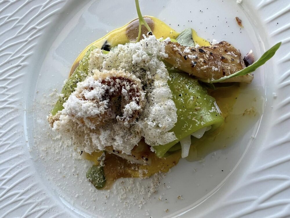 Che personalmente ho apprezzato ulteriormente in due piatti dagli ingredienti umili: il cipollotto nocerino grigliato con spuma di pappacelle e nella zuppa di pianta di zucchine con gambero rosso e gnocchi dei suoi fiori. Perché dove il vegetale dà il suo massimo, in quel piatto non ce n’è più per nessuno.