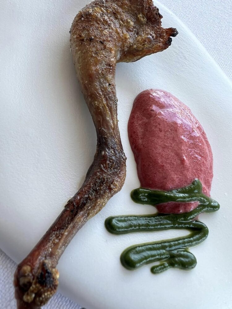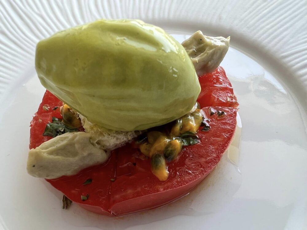 Tornando alla famosa “concentrazione”, la salsa al pomodoro cuore di bue che accompagna la ricciola marinata con hummus di ceci è una chiara esemplificazione del concetto, perché del pomodoro si sente tutto: la pianta, la polpa, il sole. Questo è il vero lusso.