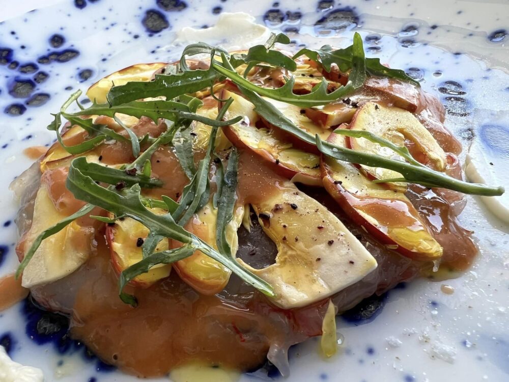 Torre del Saracino – ricciola marinata, hummus, mais tostato, pomodoro cuore di bue