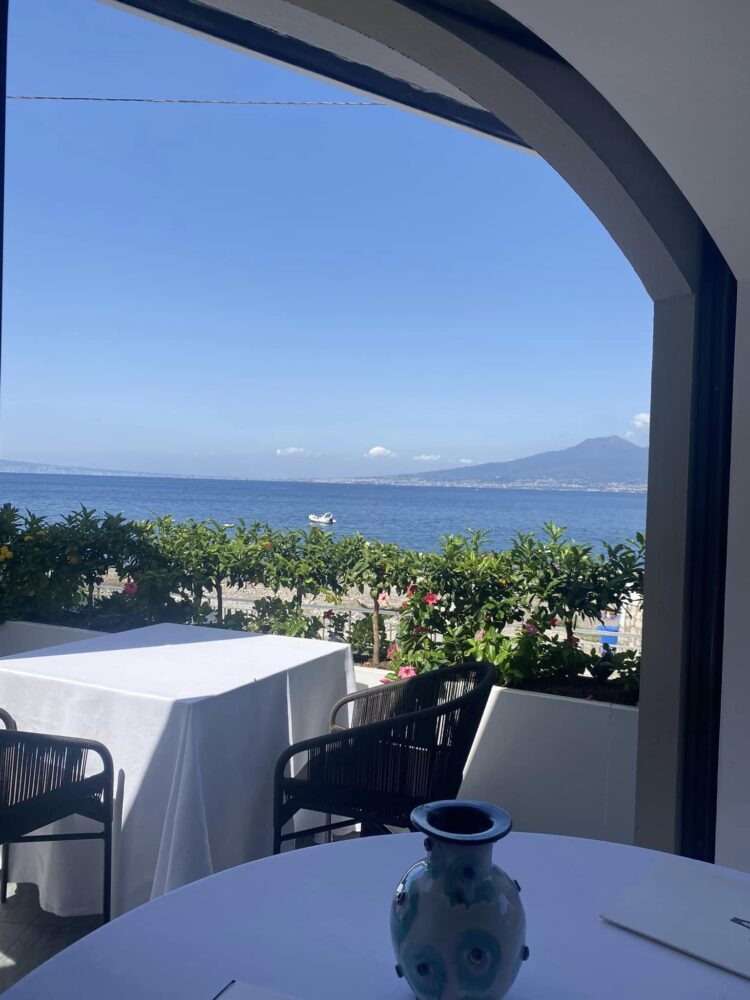 A tutto ciò si aggiunga un luogo incantevole, un’antica torre di avvistamento dei saraceni che dà direttamente sul Golfo che tutto il mondo ci invidia, con l’intensità di blu che solo da qui si gode, la vista sul vulcano che in giornate di cielo terso erutta (nella realtà speriamo di no, ovviamente) tutta la sua energia e che ritroviamo, pari pari, alla tavola di Vico Equense.