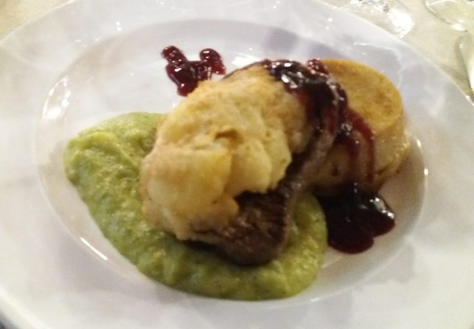 Cantina Castello di Torre in Pietra – Filetto di manzo in crosta di patate crema di zucchine tortino di cipolla e riduzione di Sagrantino