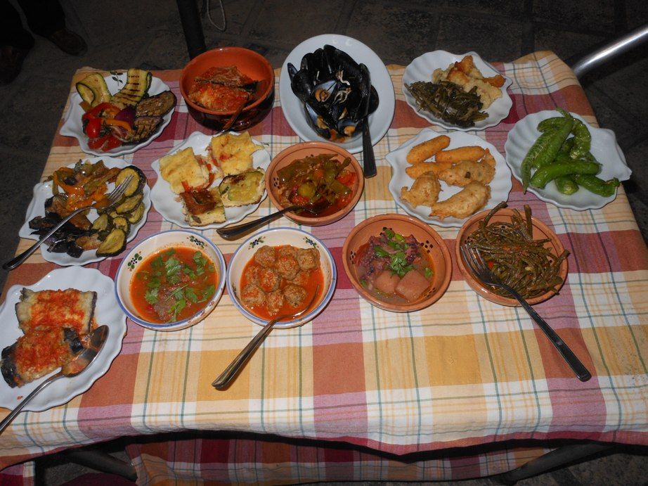 Il carrello pieno zeppo che ci hanno portato a me e al mio collaboratore Biagio Ciano è composto da pittule alla pizzaiola, crocchette di patate, frittata di zucchine, fagiolini al sugo, pitta di patate, verdure grigliate, peperonata, verdure in salsa, peperoni verdi fritti, cicorie e fave con corona di tozzetti di pane fritto, involtini di melanzane ripiene al forno, parmigiana di melanzane, polpette di vitello al sugo, pezzetti di cavallo alla diavola, polpo alla pignata e sautè di cozze. Inoltre, a parte ci hanno servito: crostata di marmellata e fette di anguria e melone, oltre a pane, vino della Casa, caffè e amaro.