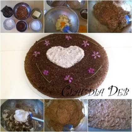In un robot da cucina, lavora il burro con lo zucchero fino ad ottenere una crema. Versa in una ciotola. Aggiungi i tuorli, uno per volta, e fai amalgamare. Unisci fecola, cacao e mandorle e mescola. Monta gli albumi a neve ben ferma. Aggiungi al composto lavorando delicatamente con movimenti dal basso verso l’altro. Aggiungi il cioccolato e continua a mescolare come prima fino ad ottenere un composto omogeneo. Versa in una teglia da 24 cm di diametro. Cuoci in forno a 180° per 35 minuti. Sforna e fai raffreddare. Decora a piacere con zucchero a velo. Io ho disegnato un cuore e applicato dei fiorellini di zucchero.