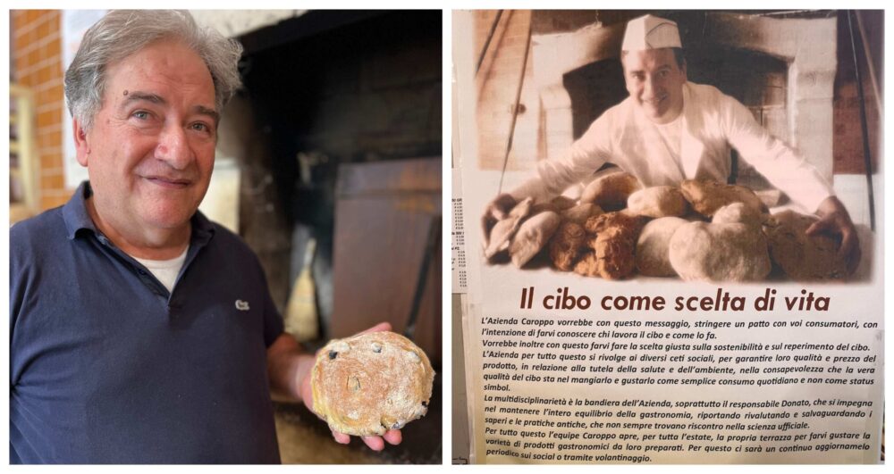 Il mattino è più frizzante nonostante il sole cocente. L’appuntamento è al forno Caroppo, un luogo dove il pane ancora racconta la terra, l’insegna di pietra apposta sulla porta recita: “le specialità della tradizione, tipiche, biologiche, dietetiche” e anticipano la filosofia di Donato, che con la moglie Annamaria ed i figli, si fanno interpreti di una cultura della panificazione che vuole tutelare ed esaltare l’intera filiera produttiva, che va dal grano selezionato da piccoli contadini del posto e sempre monovarietali, al forno, naturalmente passando per la molitura che avviene in un vecchio mulino artigianale.