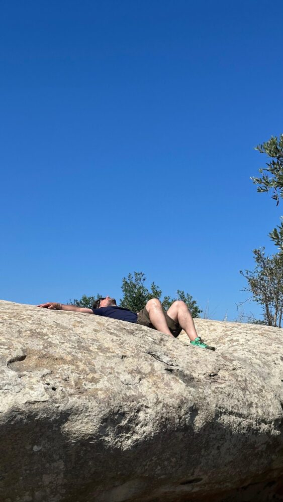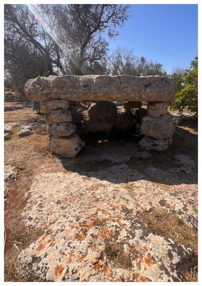 Riprendere il passo, carico d’emozione e lacrime appena trattenute, per raggiungere il Dolmen “Li Scusi” e nel silenzio di quest’angolo di mondo, tra olivi secolari che tentano il risveglio dopo il veleno delle xilella, mi seggo a respirare al tempo dello scirocco che porta il profumo del mare, mentre il tramonto si fa bello prima di perdersi a mare.