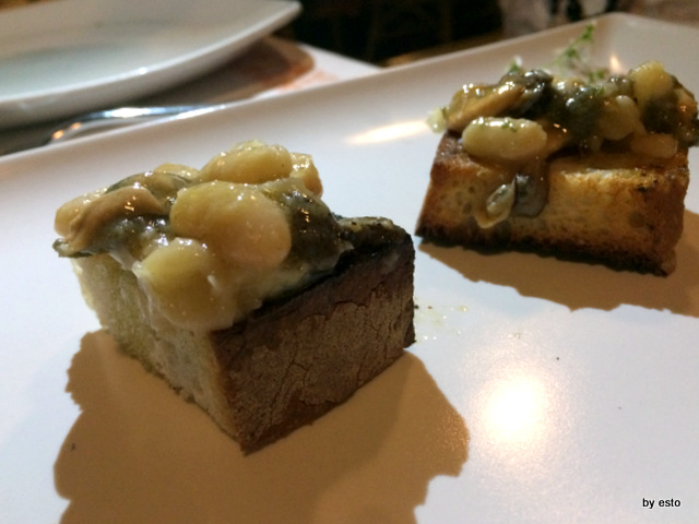 Piccoli crostini di pane cafone con cozze, cannellini e menta.