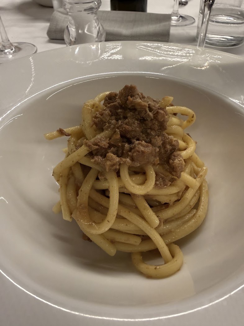 Nei primi piatti la Trattoria Alla Cima esprime pienamente la propria anima. I bigoli in salsa sono un omaggio diretto alla cucina veneziana, intensi e profondamente identitari. La pasta e fagioli, qui, non è mai un semplice piatto del giorno ma un rito che si rinnova, rassicurante e autentico.