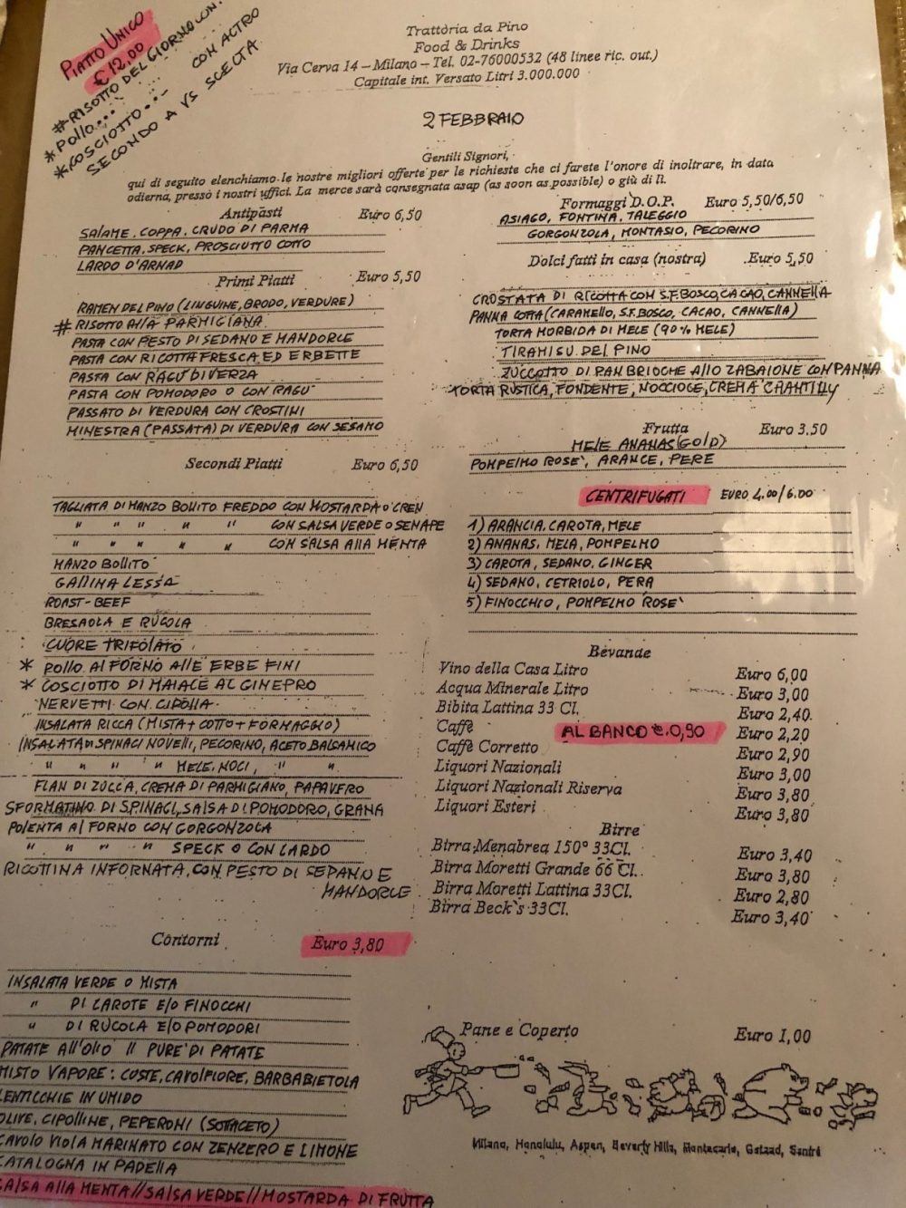 La Trattoria apre solo a pranzo da Lunedì a Sabato, è riferimento per quei lavoratori che, a mezzogiorno di cuoco, non potendo tornare nelle loro case di periferia per mangiare, vogliono trovare un’alternativa al panino ingiusto senza spendere molto, poterlo fare comodamente seduti in via Cerva non ha prezzo, o comunque, il prezzo è giusto, AUGH.