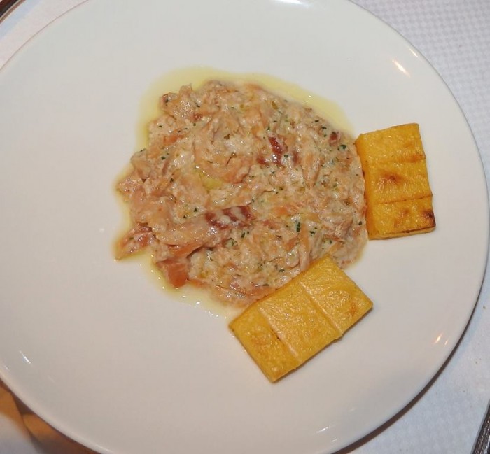 Per iniziare ad essere soddisfatto anch’io ordino la carne cruda di puledro, scandalizzando chi è con me, anche se una volta assaggiata non può non dire che è morbidissima e saporitissima. C’è chi ordina invece la Polenta Brustolà (abbrustolita) con salumi locali e giardiniera e anche qui siamo nella concretezza estremamente saporita.