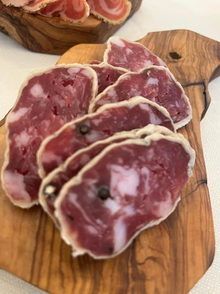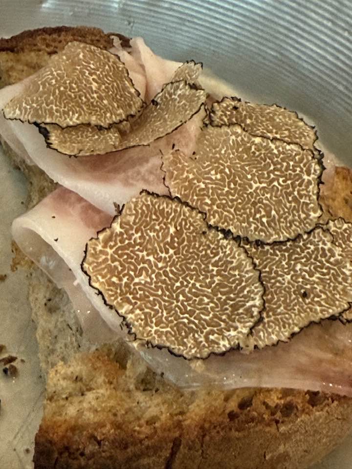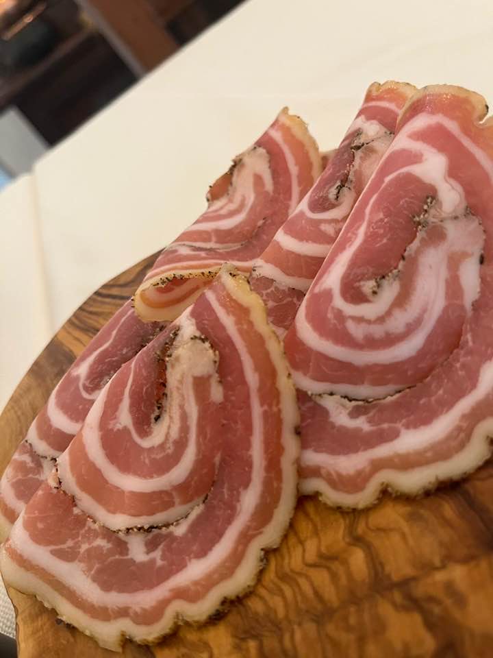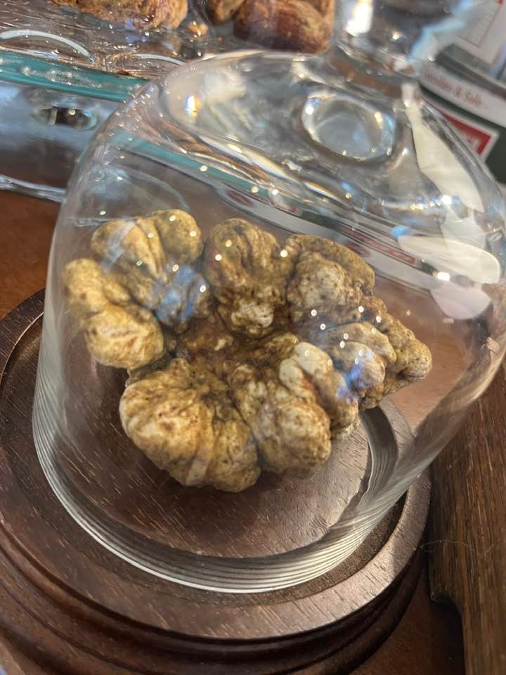 Ottima la pancetta e soprattutto la soppressata, per non parlare del guanciale sormontato da un profumato tartufo nero locale, che però impallidisce dinanzi al fratello bianco da circa 200g che fa bella mostra di sé sotto una campana di vetro, pronto ad essere affettato su tagliolini burro e parmigiano.