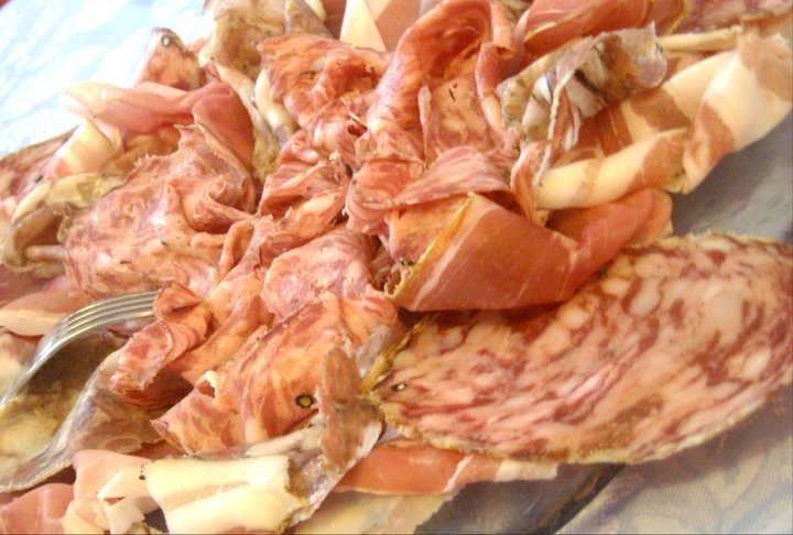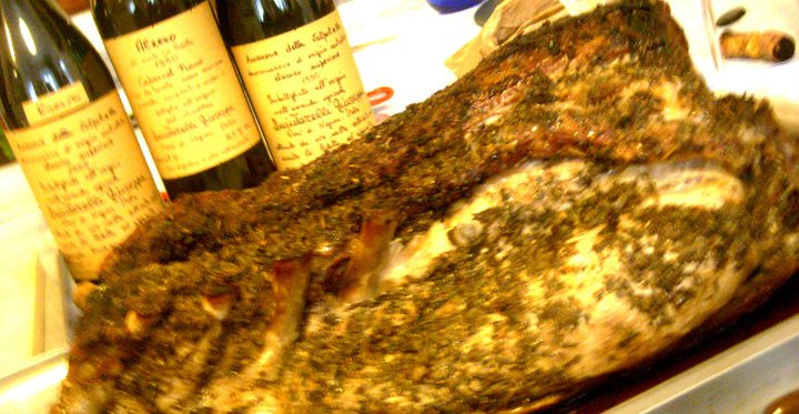 Arrivo ovviamente in ritardo, non tanto rispetto agli altri commensali, quanto rispetto alle tre bocce di Champagne che mi guardano già sgabbiate e sgocciolate: colpo al cuore se si chiamano Salon, Dom Perignon e Collard millesimati una ventina d’anni fa, degorgiati non so quando. Tre dita di Collard mi rinfrancano dalla fatica del viaggio (sic?): netti i funghi e forse il miele. Perplimo. Maialata non è ciò che penso di fronte alle bottiglie esangui, ma è un titolo, pretesto per una riunione mangereccia viaggiando a ritroso nel Levante ligure, per me che sto con un piede in Liguria e tutto il resto sbilanciato in Toscana. Sconfinando e maialando (direbbe Spigaroli, ma lui esagera anche ocando, bollendo, lumacando, ranando, starnazzando…)