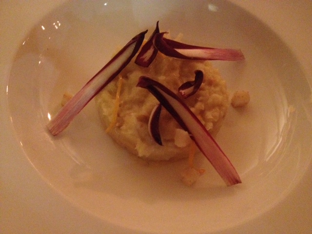 Soddisfatti e giunti al giusto livello di salivazione siamo passati ai secondi: ghiotte le crepinette di noce di vitello, salsiccia e lardo rosolate in padella con funghi e cremoso di castagne; raffinatissimo il baccalà mantecato con patate e latte, radicchio, arancia e sedano rapa.