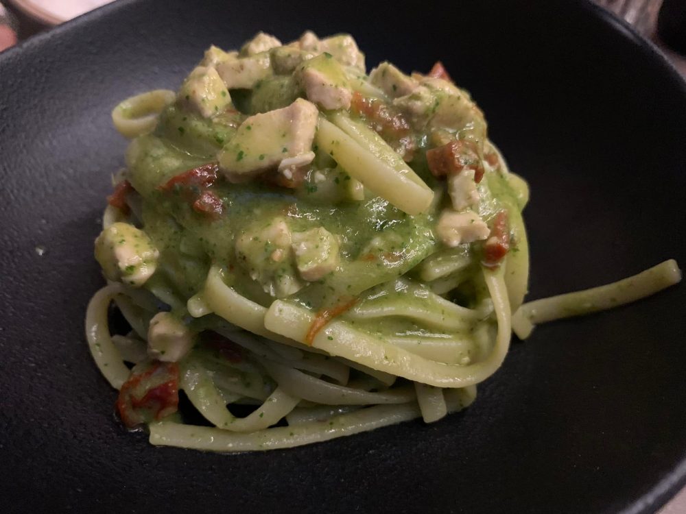 Epiro Roma, trenette al pesto di agretti, ricciola e pomodori secchi