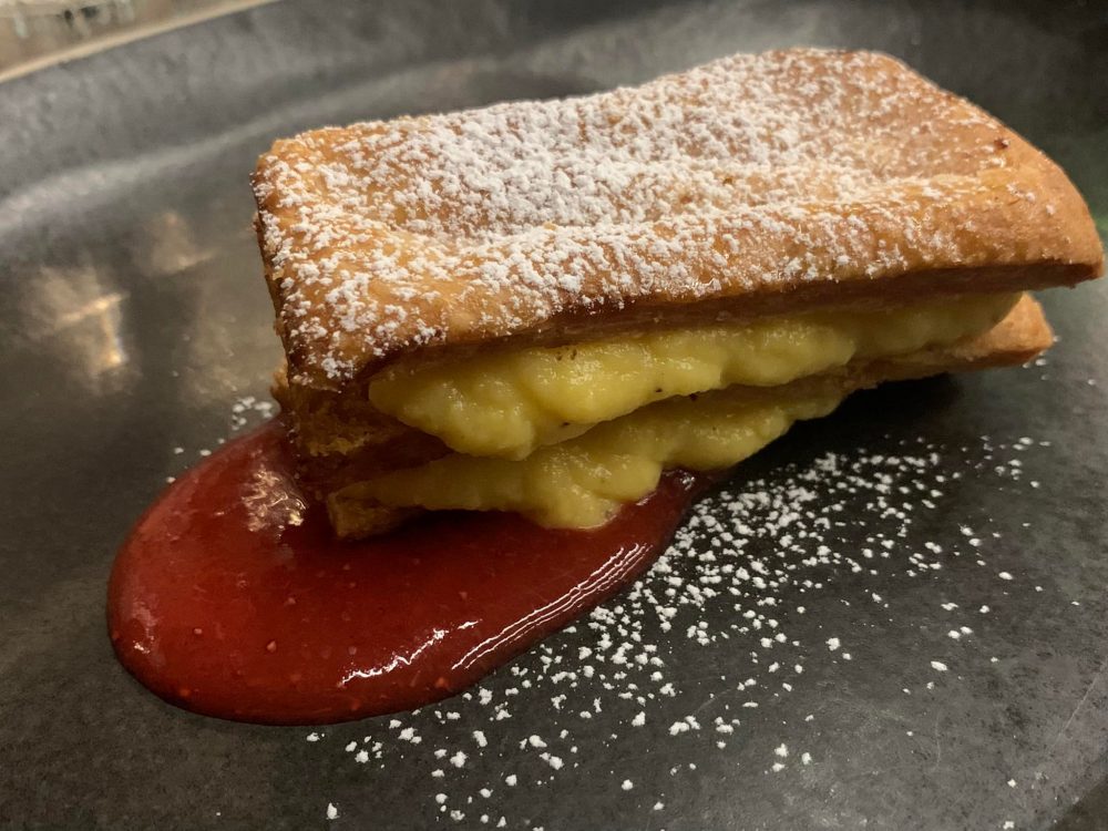 Con l’ombrina si va sul classico, mentre sono più che indovinati cottura e abbinamento dell’anatra, con salsa di mirtillo, funghi arrosto ed erborinato.