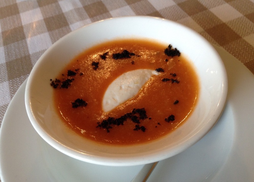 Benvenuto, pappa al pomodoro con ricottina fresca e polvere d’olive, il cestino del pane oggi non è lo stesso, fa lo stesso, saltiamo anche la foto…