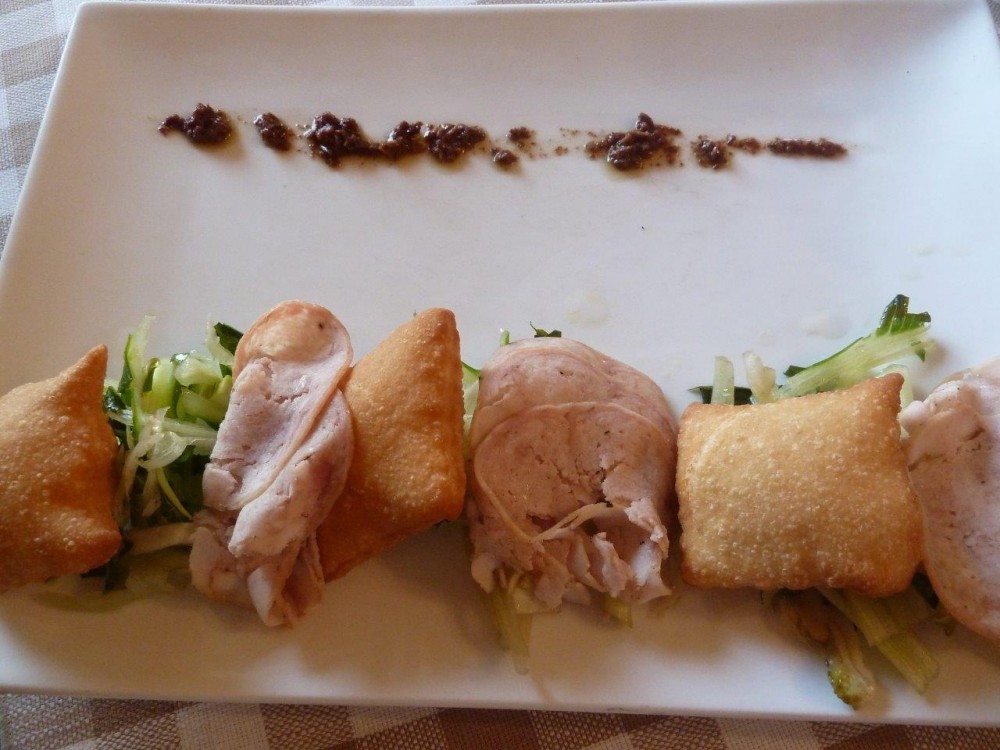 Coniglio in porchetta, puntarelle, tapenade d’olive e lo gnocco fritto incriminato, si fa per dire