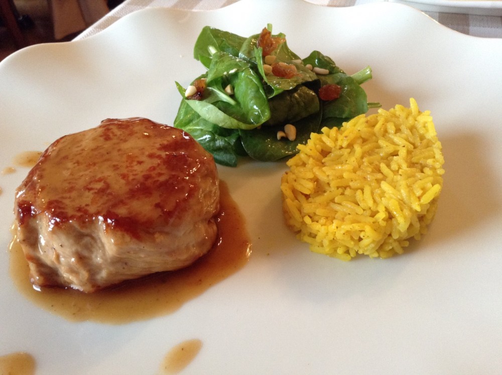 Prenoto un tavolo per due, Milano da qui sembra infuocata, punto il dito su un paio di piatti e, senza lode, su una bollicina rosé che supera con difficoltà l’esame visivo, portando comunque a casa la sufficienza piena negli altri due orali, due sensi su tre possono avere un senso, ma avrei dovuto scegliere meglio…in attesa del mitico strudel, splendide note dolci ascoltate recentemente (questa la traccia sull’ELLEPI), si parte con un benvenuto della cucina preparato per noi da Denny Manzoni che, dopo il centratissimo piatto della foto d’apertura, per quanto mi riguarda potrebbe anche prendersi una pausa caffè, lunga fino alla mia prossima visita, il nodino di vitello con spinacino novello, uvetta e pinoli, degnamente accompagnato da riso basmati al curry, si rivelerà equilibrato e gustoso, piatto davvero piacevole, succulento il nodino, i comprimari dicono la loro senza togliere il palcoscenico alla tenera carne di vitello, ed è gradevole ritrovare nel palato il fresco, il dolce il croccante e lo speziato che spingono verso un altro boccone di carne, goloso.