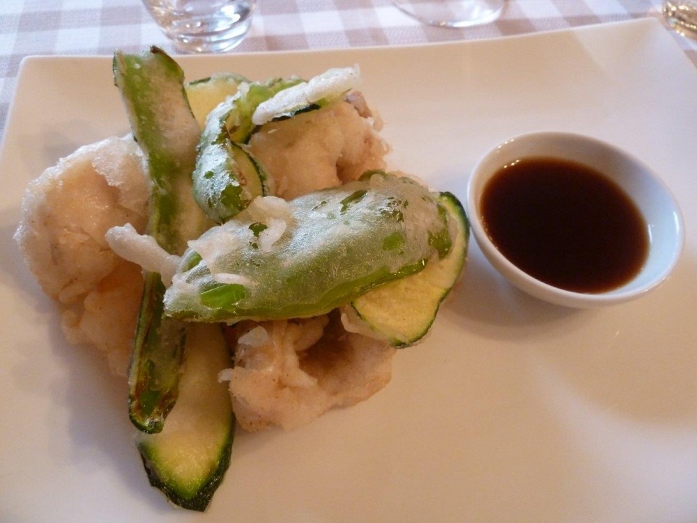 Tempura di scorfano, gamberi e verdure, con salsa teriyaki d’accompagnamento, musicale l’accostamento
