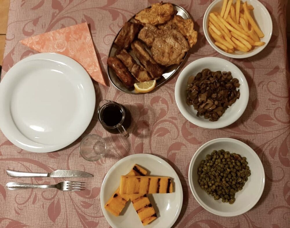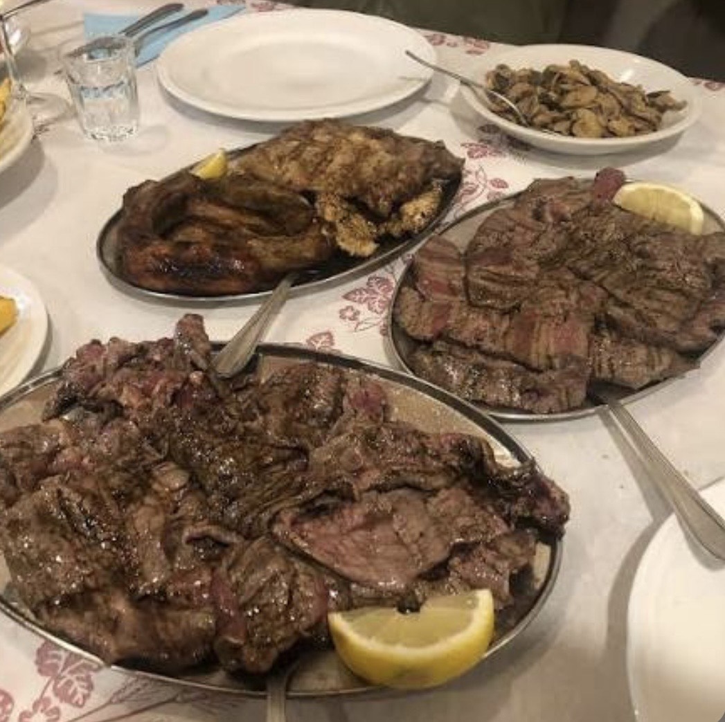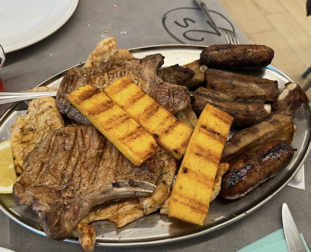 Divino, nel senso più concreto e onesto del termine. La grigliata mista con tagliata prosegue sulla stessa linea di schiettezza. Le carni sono ben cotte, succose, senza eccessi di brace che ne coprano il sapore. La tagliata arriva correttamente riposata, tenera, accompagnata da patatine croccanti e funghi. È un piatto generoso, pensato per essere condiviso, che trova la sua forza nella sostanza e nella continuità. Il capitolo dolci chiude il pasto con coerenza.
