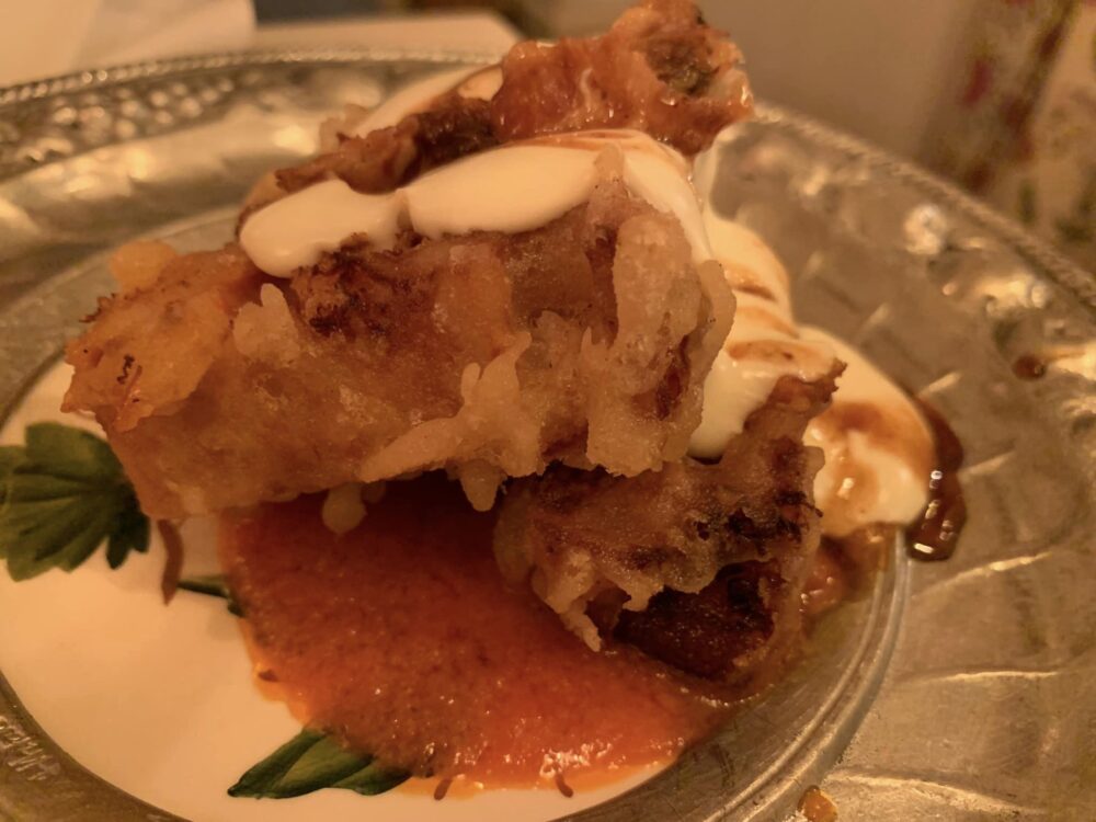 Eravamo pronti a testare la pizza romana, caratteristica di questo locale insieme ad una serie di piatti iconici italiani ma dal forno, con nostra somma gioia, sfornano le pizze napoletane a ruota di carro e scegliamo la classica margherita e la provola e pepe, conosciuta a Napoli come ‘ a pizza d”o pizzajuolo. Ci consoliamo, scegliendo dalla lista dei vini italiani, con l’Aglianico del Taburno de La Fortezza a Torrecuso, in provincia di Benevento, che ben si accompagna alle due pizze. Perfette, proviamo anche un frittatina di pasta all’amatriciana ma questa non ci soddisfa.