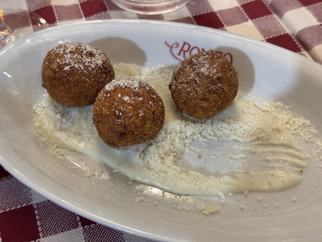 Supplì cacio e pepe. Millefoglie di pere e Pecorino Romano DOP. Crostino con cicorietta ripassata e fonduta di Pecorino Romano DOP