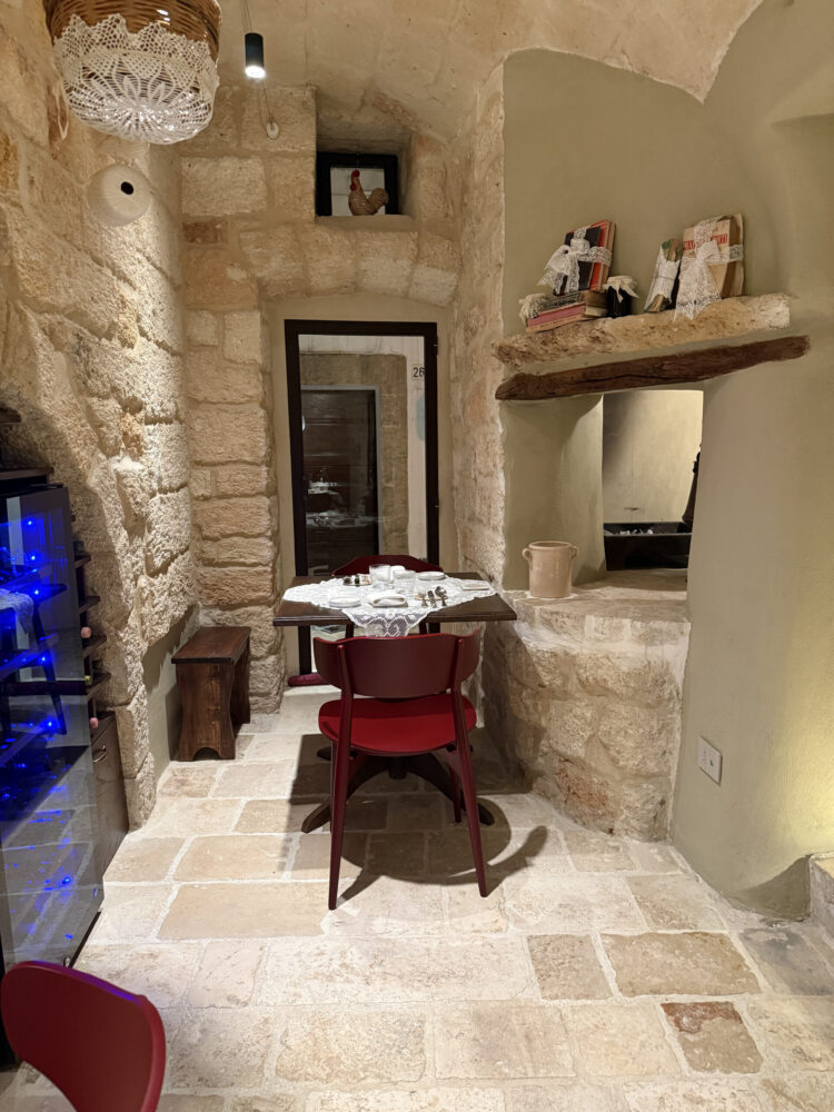 C’è un punto, tra le vie del centro storico di Polignano a Mare, in cui il brusio dei turisti si attenua e si torna a camminare con passo più lento. È in una strada secondaria, lontana dall’andirivieni continuo, che si trova Trattoria Rosso. Un nome che richiama il calore della masseria pugliese e che trova coerenza appena varcata la soglia.