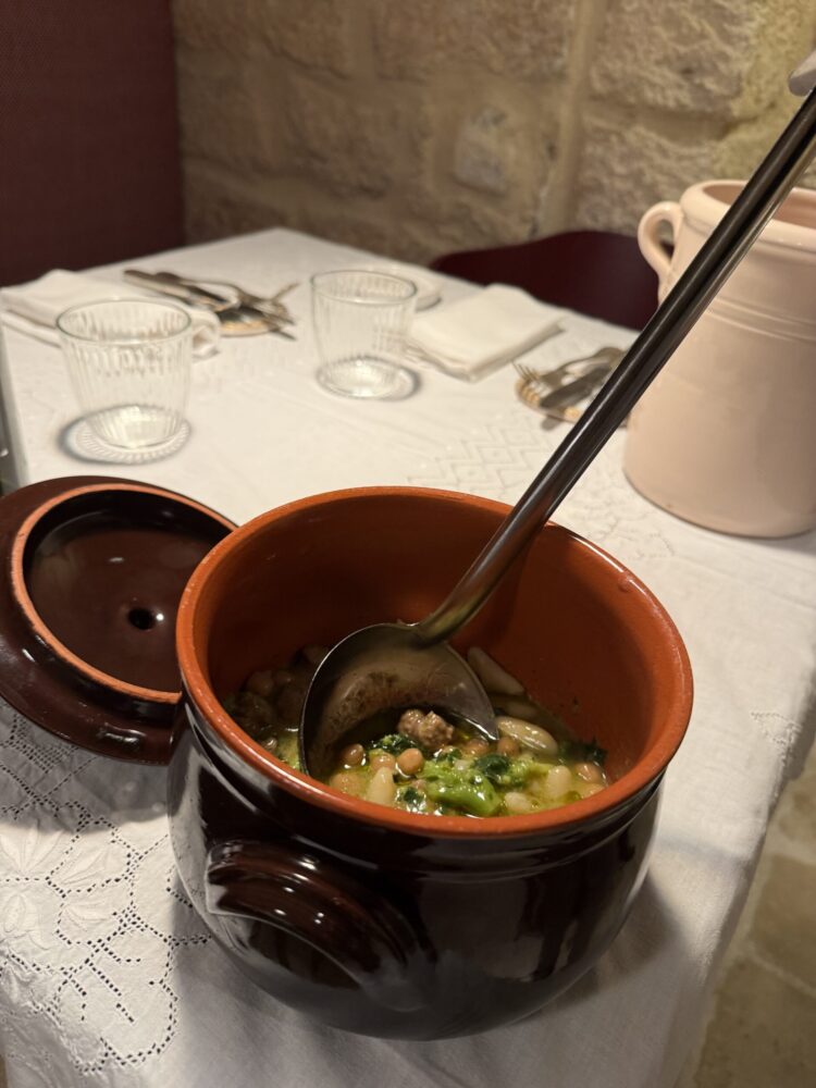 La minestra che ho scelto è la pignata con cavatelli fatti a mano, ceci, zampina e cima di rapa. Un piatto che restituisce immediatamente la dimensione domestica, con una pasta tirata in casa che conferma la volontà di non accorciare i passaggi.