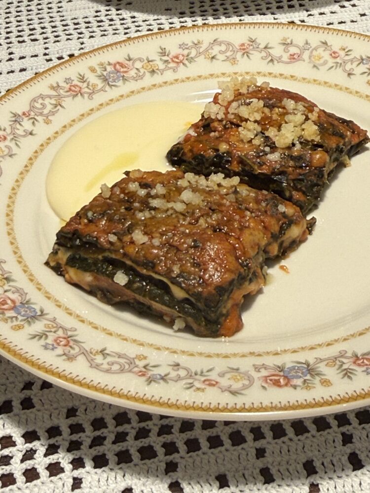 Tra i secondi, il rollè di vacca podolica con prosciutto biologico di suino nero e caciocavallo podolico racconta una filiera precisa e una scelta di materia prima coerente. Il diaframma alla brace, accompagnato dalla sua salsa, riporta invece a una sensazione più rustica, quasi da grigliata in campagna, con quella nota intensa che rimane netta al palato.