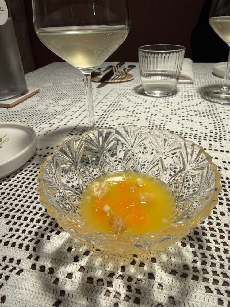 Il benvenuto è una zuppa d’arancia e mandarino con pane croccante, sedano, olio e succo d’arancia. Un inizio che affonda nella memoria contadina, quando il pane raffermo veniva immerso nel brodo caldo con l’arancia condita. Qui la tecnica è evidente, ma non invade. È un’apertura fresca, misurata, che prepara il palato.