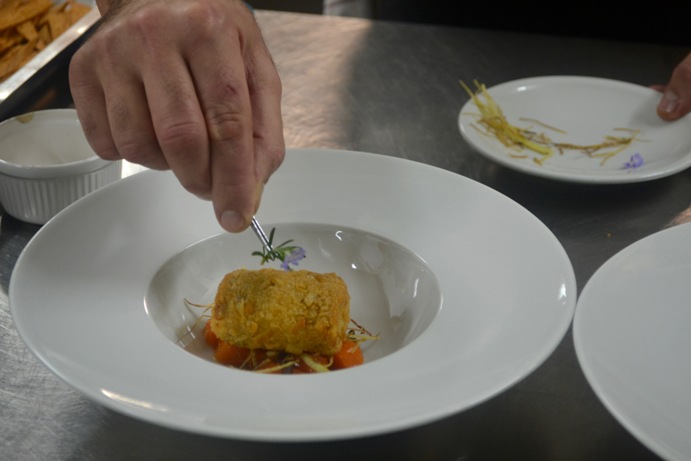 Dopo lo sgroppino alla mela verde e lime in cromatura di bosco, si passa alla guancia di maialino brasata con “micciato” (vino tipico pimontese) a bassa temperatura.