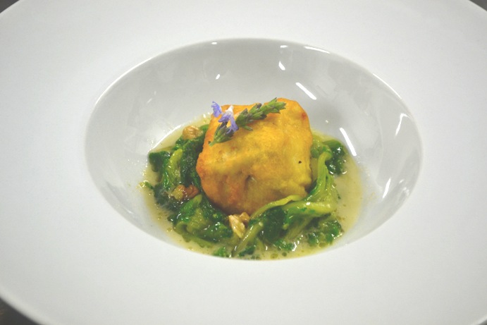 Raffinate la ricciola in tempura di birra con guazzetto di scarola e bufalina.
