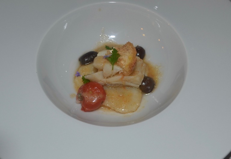 Si parte così con la zuppetta di cannellini, verza e guanciale con spiedino di gamberetti e kataifi, seguita dalla trippa di baccalà, patate e porro.