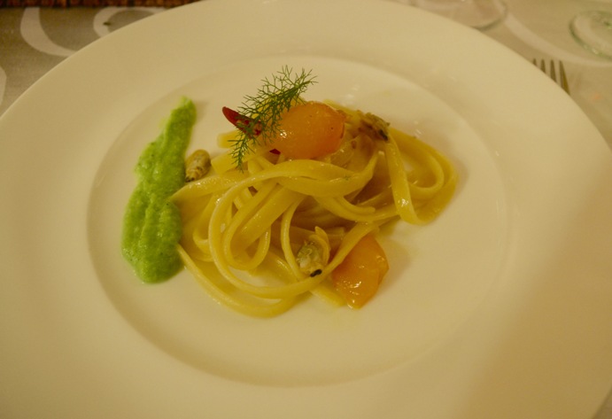 Si continua con un assaggio di tre tipi di pasta: il miscuglio potente con cavolfiori, gamberi rossi e colatura di alici; le fresine con ristretto di vongole, spaccatelle gialle e cremoso di broccoletti; i fusilli a mano con ragù di cinghiale, carciofi e frutta secca.